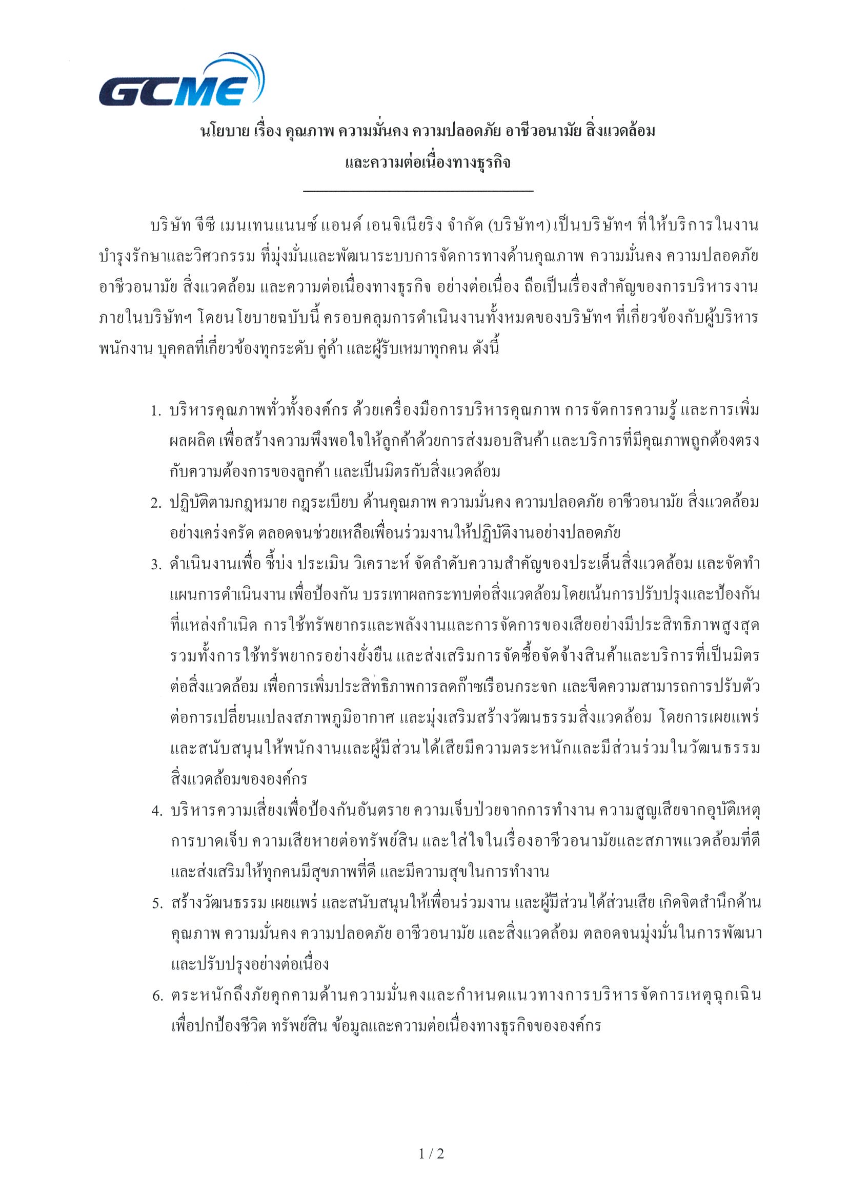 นโยบายเรื่อง คุณภาพ ความมั่นคง ความปลอดภัย อาชีวอนามัย สิ่งแวดล้อมและความต่อเนื่องทางธุรกิจ