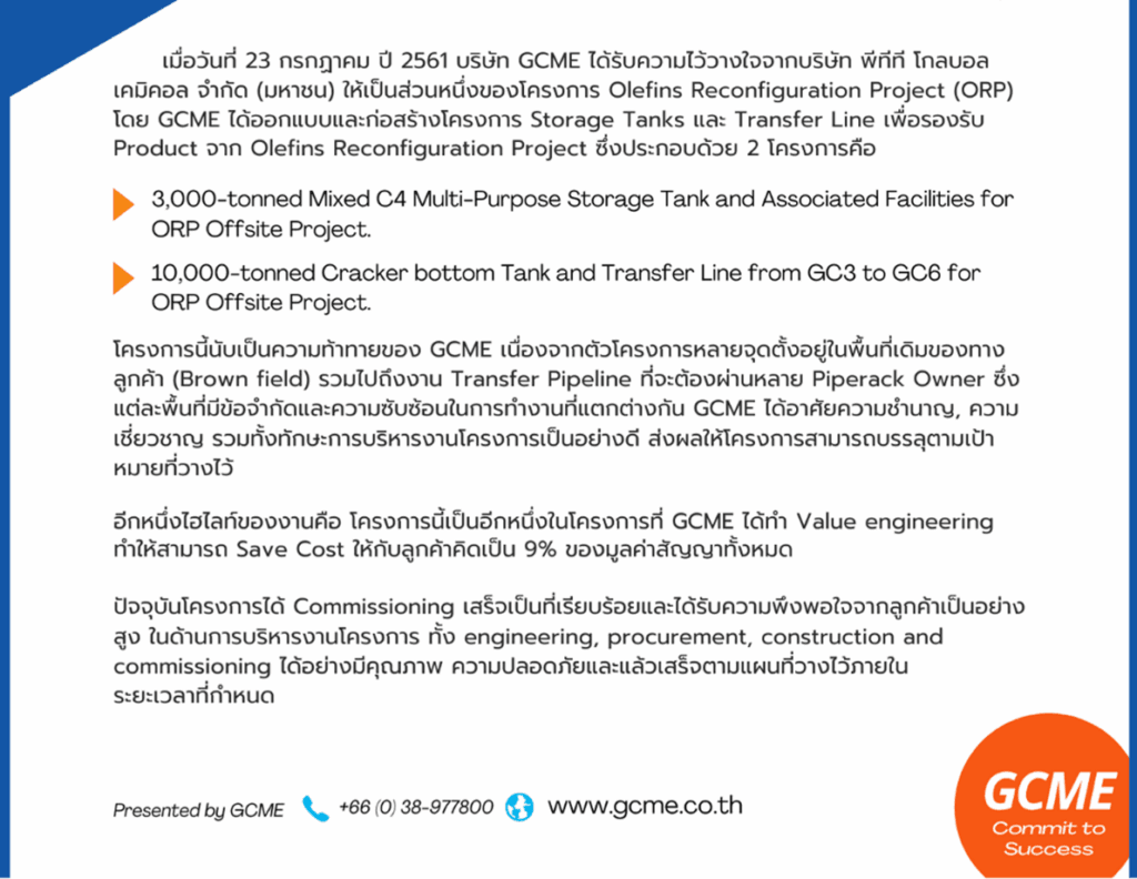 ข่าวประชาสัมพันธ์ : อีกก้าวหนึ่งของความสำเร็จ GCME ในโครงการ Olefins Reconfiguration Project
