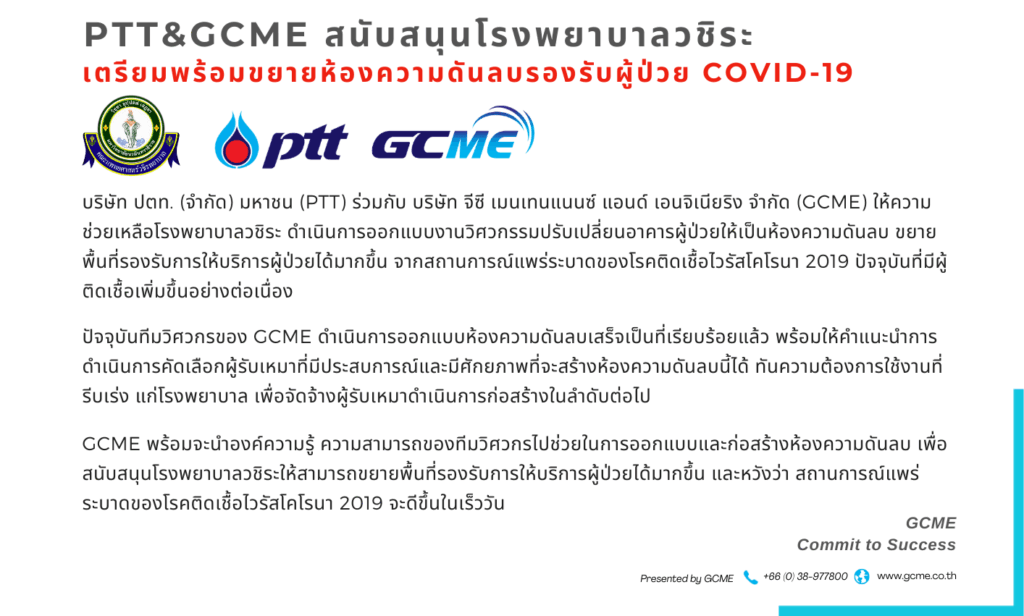 GCME สนับสนุนโรงพยาบาลวชิระ เตรียมพร้อมขยายห้องความดันลบรองรับผู้ป่วย COVID-19